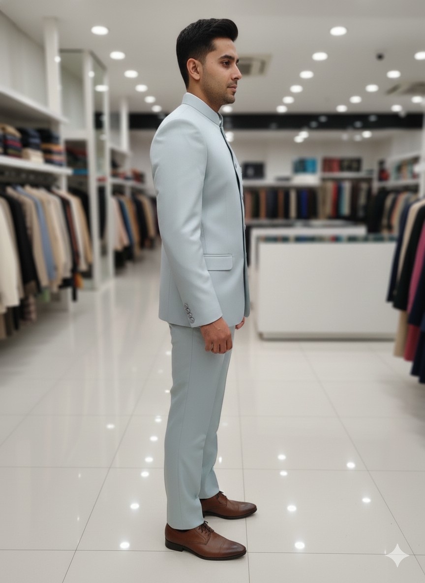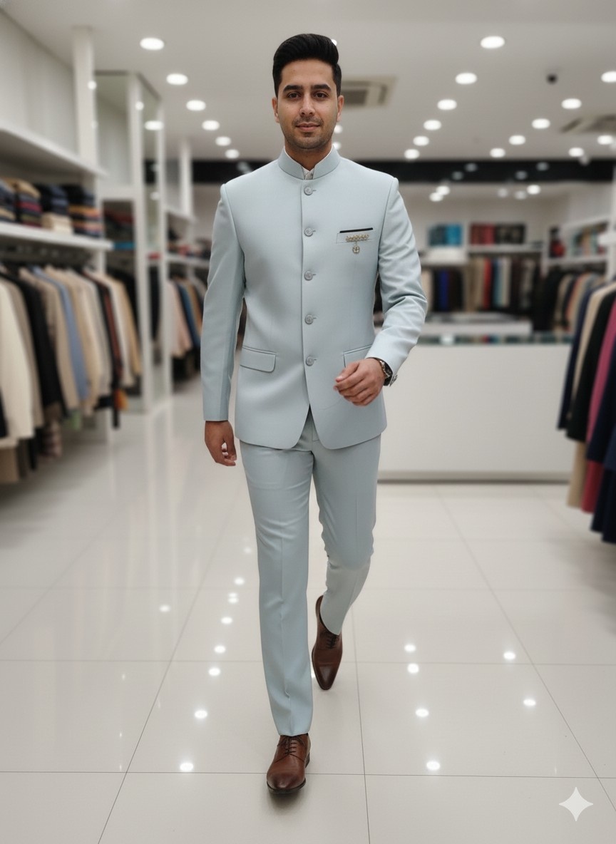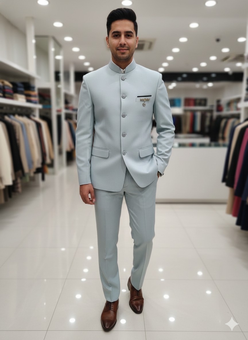 Pair the light blue Jodhpuri with matching trousers or white/ivory churidar. Complete the look with polished brown or black leather Oxfords or classic mojaris for a refined finish.